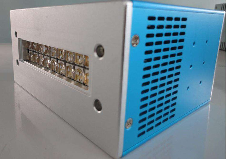 UV LED配备的特制聚光透镜总成也使它的能量高度集中在固化点上,提升了紫外胶的固化效率,可以同时驱动8路(每台设备可以装8条LED管),分别独立控制,为用户降低成本,同时照射增大面积 。