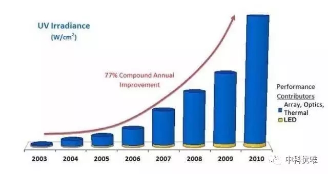 uvled光固化机的输出功率在最近几年得到了相当大的提高,从若干家供应商所提供的产品指标数据可以看出,从2005年到2011年输出功率的复合年均增长率在5%到10%之间。但对于LED整体表现的评估,另外三个因素对于增加LED的效能更加重要:阵列、冷却和光学系统。