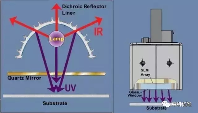 基于最终的应用需求,光学工程师必须决定应该采用何种形状、形式以及材质来最好地利用LED的独特性能,然后还需要注意LED是一种泛光形式的光,而不像汞灯模式中紫外光被反射罩反射并指向特定的点并具有一定的聚焦长度。下图标出了传统汞灯和UV LED灯在这一点上面的不同。