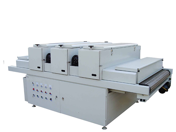 高压汞灯。该灯管光变普范围在350 nm-450 nm之间,主峰值为365 nm,采用进口石英管材及钨钼材料,用料好、强度高、寿命长,灯罩与工作面140-180mm高度范围可调,提高了固化质量,并可全光或半光工作。输送部分采用辊筒式输送设计,不易变形,运送物料更加平稳,工作中无需调整,没有噪音,改善了由于输送带跑偏而产生的不便维修很方便。配置大流量排风系统,散热效果好,确保箱体内的温度始终在标准值范围内,使
