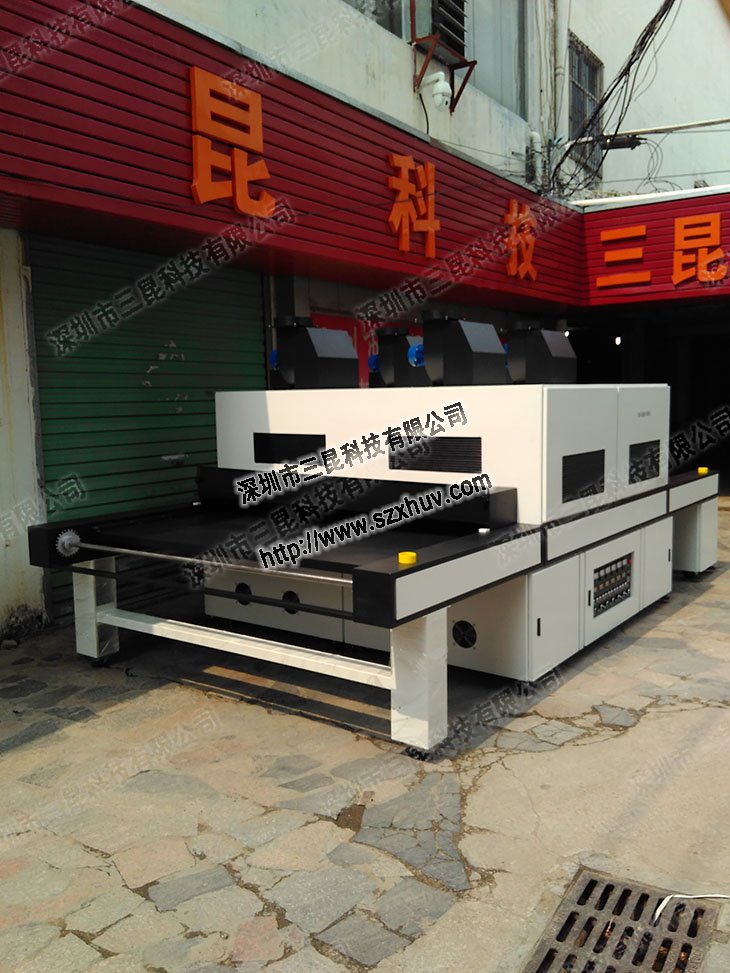 UV烘干机,主要应用于紫外线(UV)油墨的光固化和特殊的皱纹效果(需加装皱纹系统)等。如UV冰花、UV皱纹、UV雪花、UV发泡、UV磨砂、UV凸油等多种工艺结合的产品的光固化??膳浜闲北凼剿坑』?、垂直式丝印机、丝印机取料机械手完成生产。应用范围广,通过紫外线照射液态材料表面使液态材料短时间内凝固,速度及快。