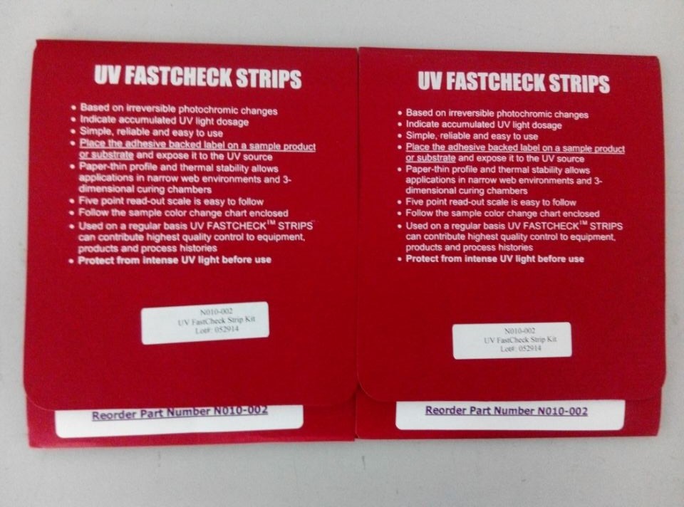 UV测试纸的使用是一种简单有效用以测试UV强度的方法。在测试纸上有五个小格,分别可以对不同强度的UV光作出反应并改变颜色。用此种测试纸可以简单方便地对UV光源进行检测,从而断定设备上的UV强度是否还足够用来固化所需的产品。